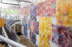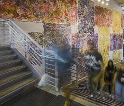 In today’s rapid pace of visual consumption, we might be used to looking at artworks in galleries and museums as quick as we look at online reportage. Creating “Time Traveler” specifically for the “Tall Wall Space” at the University of La Verne, took into consideration the unique nature of the space, and the fact that the audience’s viewing experience should be a continuous one, impossible to absorb at a glance. Rotem Reshef aims to create a suspended composition that will take the viewers on a labyrinthian journey, sprawling through the different atmospheres, colors and techniques.