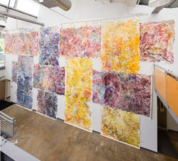 As an Action painter, Reshef endeavors to represent the passage of time through varied methods of layering compositions on large scrolls of canvas. By using diluted paints, her initial control over them is limited. Her process includes pouring the paint on the horizontal surface, and covering it with different kinds of plastic sheets, bubble wraps, threads, ribbons and leaves, harmonizing the natural, the synthetic, the functional and the symbolic. By incorporating the “cheap” and peripheral materials into the work itself, Reshef balances the hierarchies of the “precious” and the “wastable”, giving an expression to the silent, hidden participants in the artworld game. Reshef is collecting painterly memories, documenting their impressions on the canvas and weaving them into a holistic organic world. Peeling the plastics off the drying paint, unveils layers of somehow “distorted” paintings, as the plastic takes off part of the paint, leaving a “ghostly” appearance, a lean evidence to something that existed and was taken away.